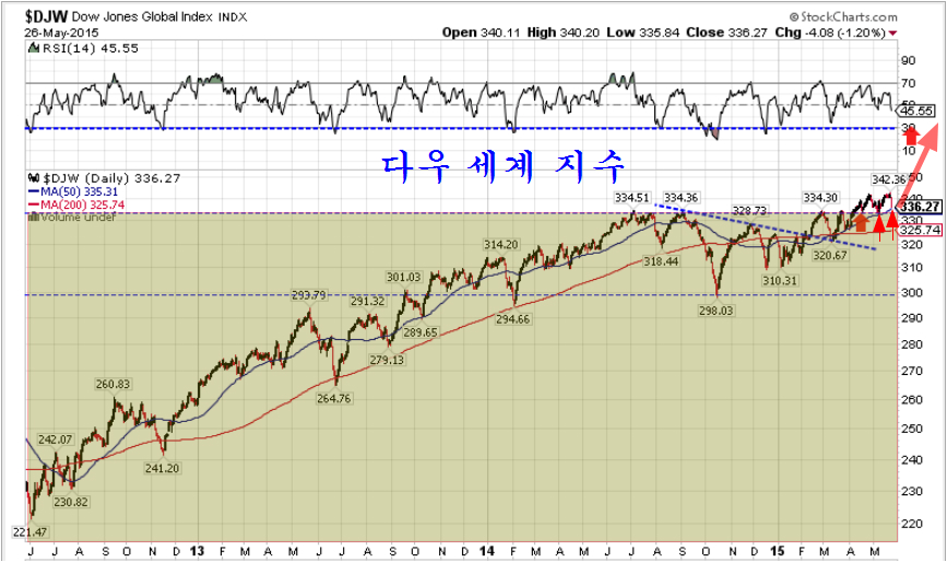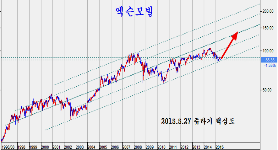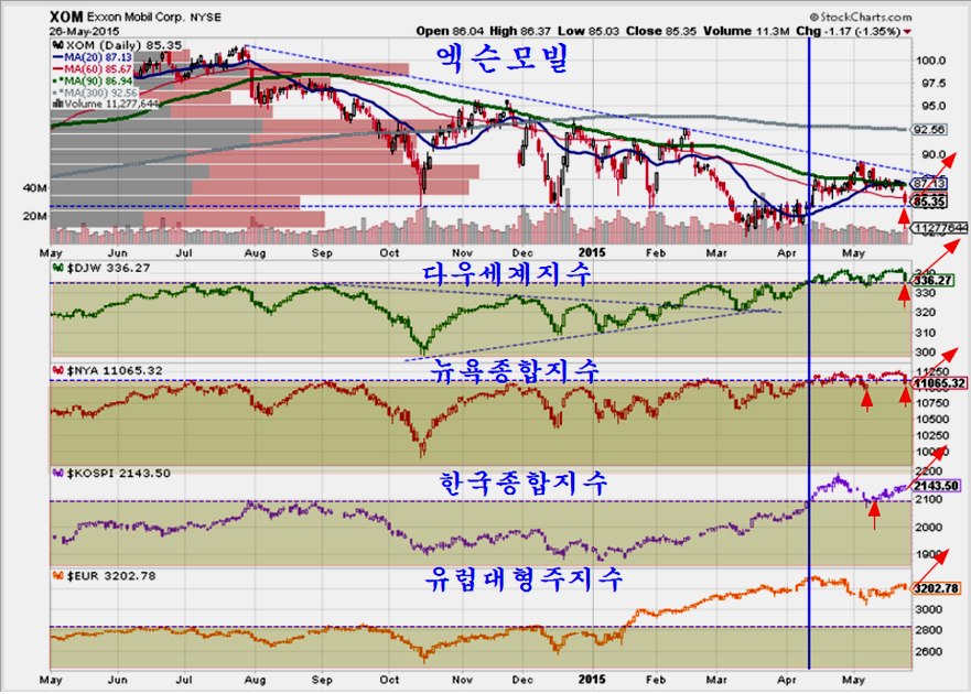 그러나 엑슨모빌 자체가 더 하락이 어려운 지지권인데다가, 이미 10개월 넘는 저항을 돌파한 다우세계지수와 뉴욕 종합지수가 지지권으로 회귀하여 하락과 함'께 상승이 시작되는 조건을 만들고 있다.