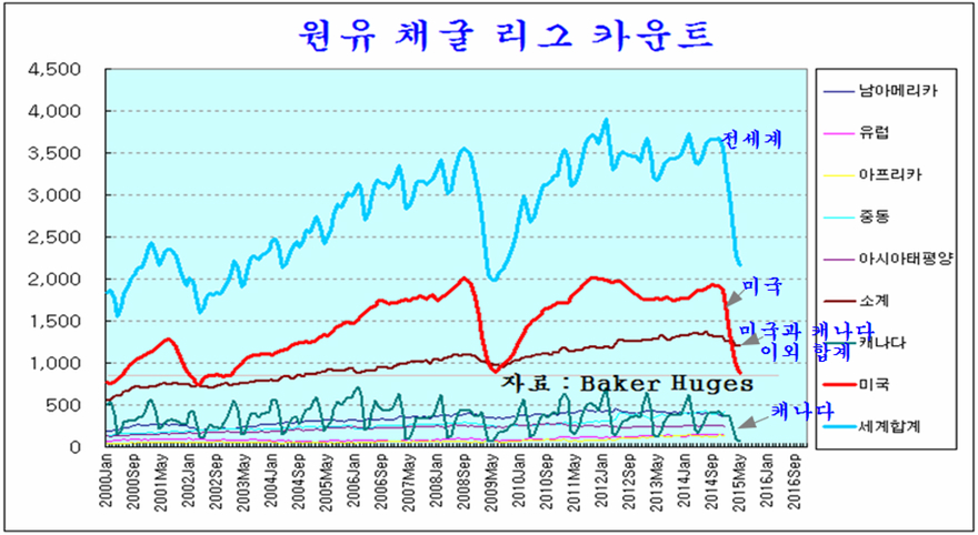 일반 유정과는 달리 한번 시추하면 2~4년이면 수명을 다하는 셰일 오일 생산은 생산이 계속되기 위해서는 지속적인 탐사 시추가 이어져야 하지만, 유가 하락과 함께 탐사 시추용 리그수가 급감하여 장차 미국의 원유 생산 감소는 장기간 이어지기 쉽다.