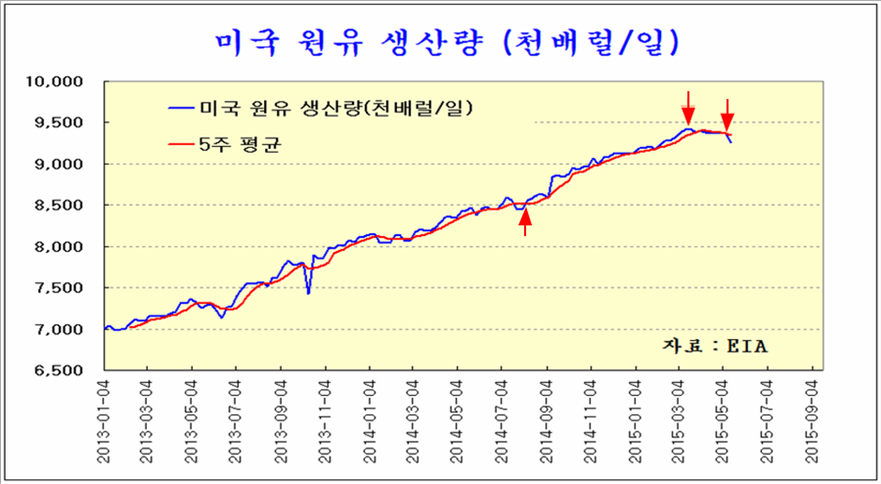 지난해 미국의 셰일 오일 증산과 함께 원유 가격이 하락했지만, 올들어 유가가 하락하고 이에 따라 원유 탐사 시추가 줄어들면서 3월 중순을 기점으로 미국의 셰일 오일 생산이 정점을 찍고 감소하고 있으며, 특히 5월 들어 미국의 미국의 원유 생산 감소는 보다 가파라지고 있다.