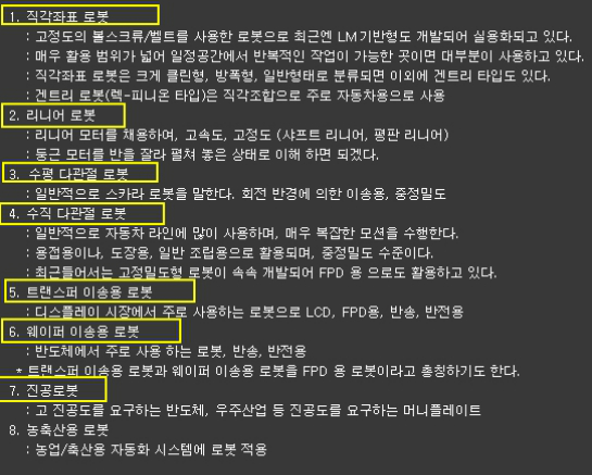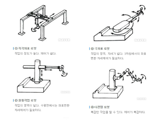 [입력 정보ㆍ교시에 의한 분류] ① 매뉴얼 매니퓰레이터(manual manipulator) ② 고정 시퀀스 로봇 ③ 가변 시퀀스 로봇 ④ 플레이 백 로봇 ⑤ 수치 제어 로봇 ⑥ 지능 로봇
