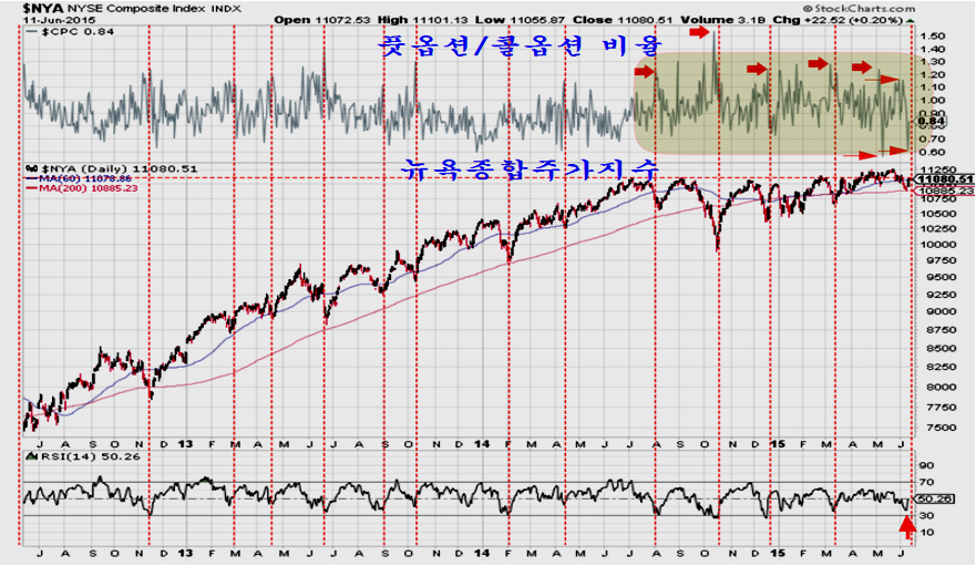 뉴욕증시의 풋옵션/콜옵션 비율 지표를 보면 뉴욕 증시 역시 옵션 거래 규모가 확대되면서 시장이 특이한 변동을 보이고 있다. 지난해 엑슨모빌의 하락과 함께 풋옵션/콜옵션 비율 변동성이 한층 커진 반면, 주가는 이전의 추세를 벗어나 정체 국면을 이어가면서 선물 또는 옵션 만기 주기로 변동을 하고 있다.