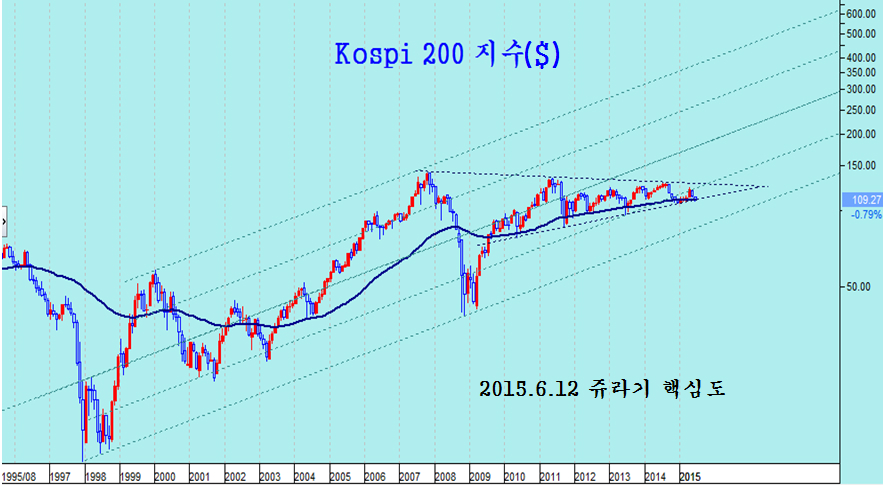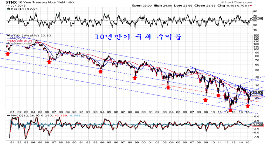 그간 경기 회복과 하반기 물가상승( 지난해 급락한 상품지수의 분모 효과를 감안하면 하반기 물가상승률이 크게 오르는 것으로 나타나게 된다.) 때문에 금리의 상승과 채권가격의 하락은 불가피 하다. 그러나, 최근 고점은 2007년 고점과 2010년, 2011년, 2013년 고점을 잇는 대세 저항에 접하는 곳인 만큼 차익 매물이 강한 곳이다.