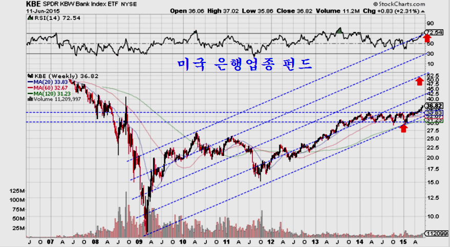 이 펀드는 현재 36에서 움직이고 있으나 핵심 구조의 상단이 100에 있어 이 수준을 목표로 상승하기 쉽다. 따라서 매우 대략 세배 가까운 상승 여력이 있어 현재 미국 은행업종은 투자가 매우 유망하다.