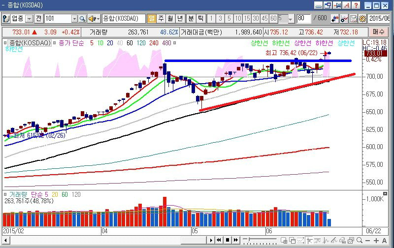 이런경우 코스피,대형주 양대 시장은 20선의 하락각을 돌리는 시간이 많이 걸리고