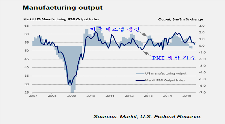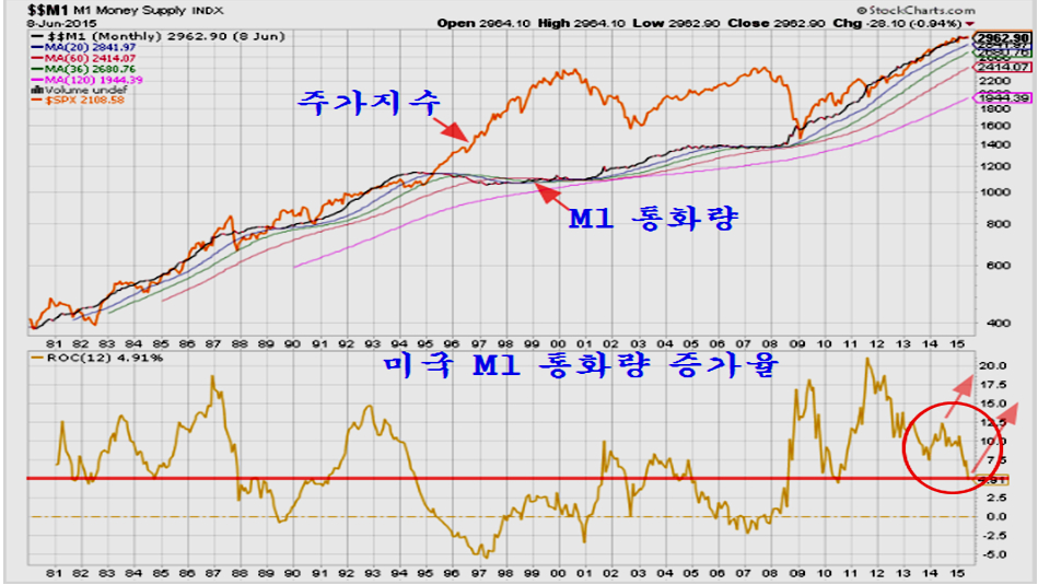 2014년 이후의 미국 M1 통화량 변화를 보면 2014년 상승 추세로 움직이던 세계 증시와 상품가격을 하락으로 유인한 데는 미국의 M1 통화량 증가율 감소와 연관이 있는 듯 하다. 특히 2015년 들어 M1 통화량은 매우 이례적으로 빠른 하락을 보이고 있어 2015년 주가와 상품 가격 상승이 억제된 이유를 설명해 준다.