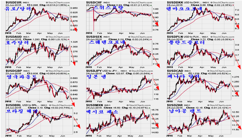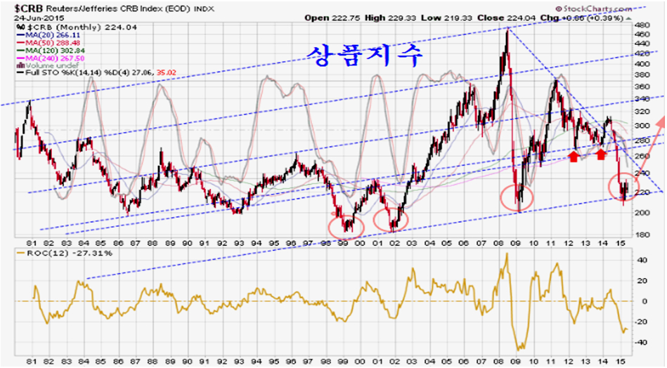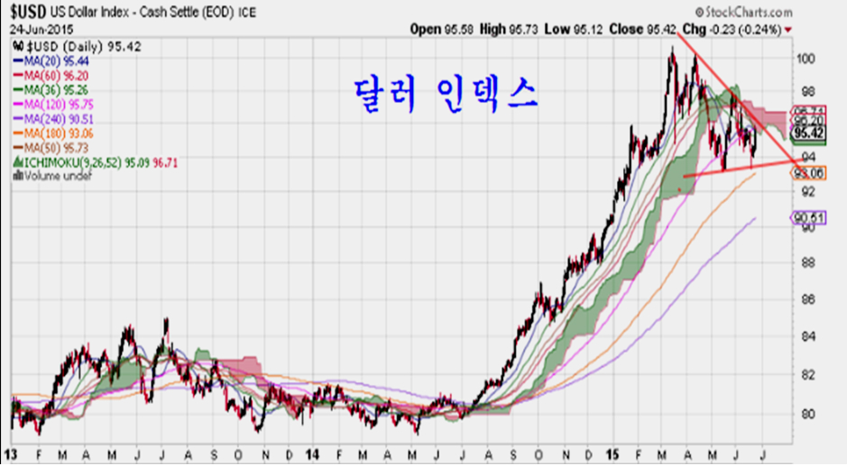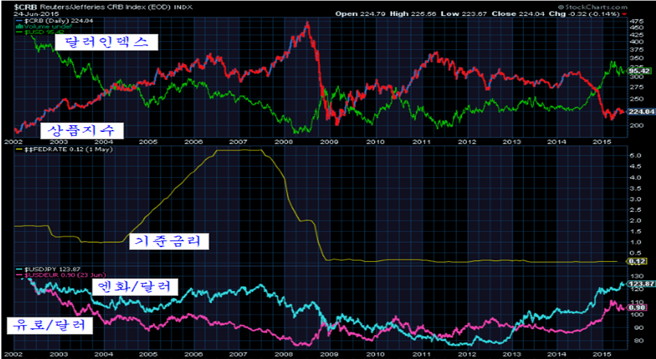 3월 정점을 지난 달러는 FRB와 미국 정부의 의도와 함께 여전히 고공권에 머물며 쐐기형 조정 국면이 이어지고 있으나, 이제 이 강한 달러 시대가 끝날 때가 되어 있다. 경기 회복에 따르는 에너지 가격 상승과 적어도 6년만의 가장 강력한 엘니뇨 상황에서 곡물가격 상승이 더 이상 상품가격을 낮게 유지할 수 없기 때문이다. 이런 점에서 달러는 변곡점이라 할 수 있으며 장기 하락을 대기하는 국면이다.