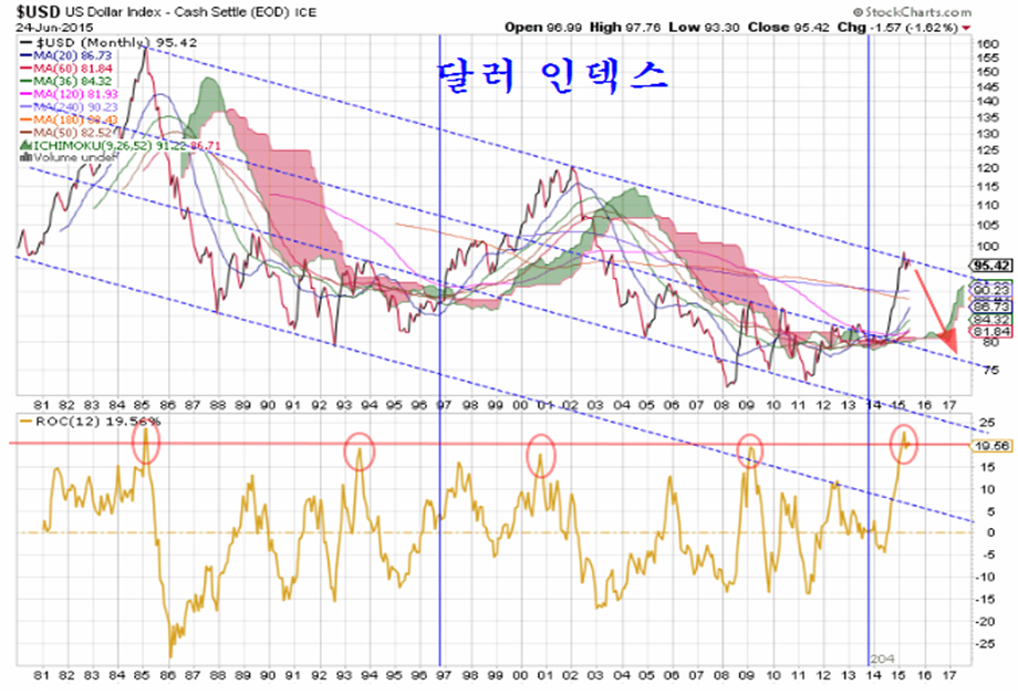 과거 바닥의 주식 매집 과정 1980~1985, 1998~2001년에서 강한 달러가 유지된 이후 달러 하락과 함께 가장 강력한 상승장이 전개된 것처럼 2011년 이후 강세를 유지해 온 달러는 과거처럼 향후 3년간 강한 급락과 반등을 포함한 재하락까지 6년간의 하락 국면을 기대할 만 하다.