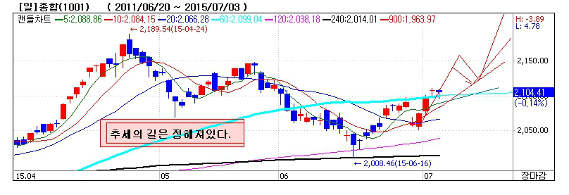 큰기초의 흐름은 변화가 없으며 작은 기조흐름에서 조정이 나왔다. 미세흐름이라고 할지, 작은흐름 중 일봉흐름이라고할지, 작은 흐름 중 일봉흐름이라고 하는 편이 타당할 듯하다. 이 흐름에서 기 언급대로 약한 음봉마감이다. 이번주에는 7월옵션 만기일이 7월 9일에 있다. 지수 조정추세선 상단부 돌파에 따른 당연한 물량소화과정과 이번주 옵션만기일이 맞물려 주초반 강한 상승을 기대하기에는 난망해 보인다.