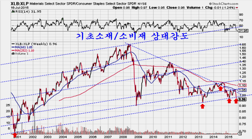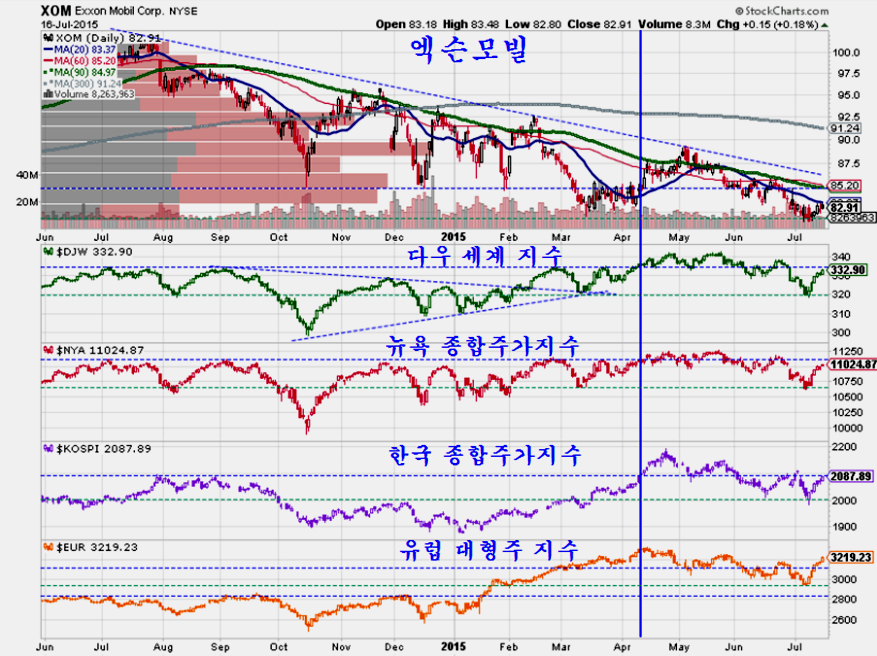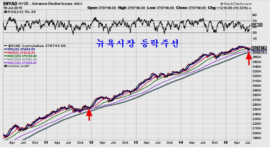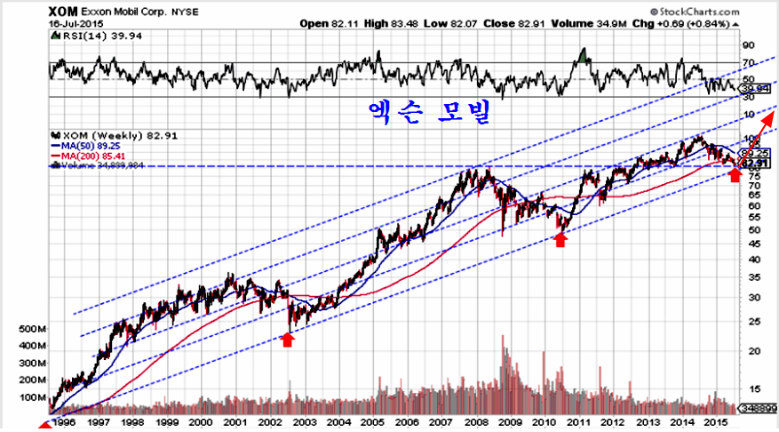 미국 시장의 방향성에 대해서는 시가총액 1위 기업인 엑슨모빌이 대세 채녈의 맨 하단에 위치하여 장기 상승 추세 전환을 앞두고 있고, 상승종목의 수와 하락종목수를 지수화한 등락주선이 2011년 하반기 이후 4년 만에 200일 평균선 지지권까지 조정을 거쳤다는 점에서 장기 상승이 준비된다고 하겠다.