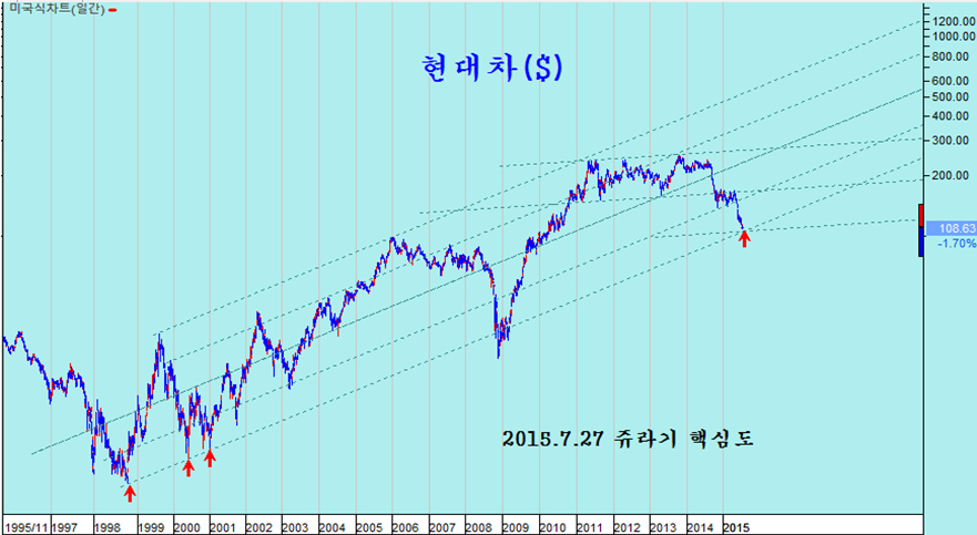 오늘 일제히 하락한 자동차 업종 우량주는 현대차가 대세 추세의 하단에 접하면서 2011년 4월 이후 시작된 하락 국면이 마무리 된 듯 하다. 이미 바닥을 만들고 상승을 준비하는 중소 우량 부품주와 타이어 및 고무 업체와 함께 자동차 업종이 장기 하락을 끝내고 장기 상승으로 전환할 때이다.