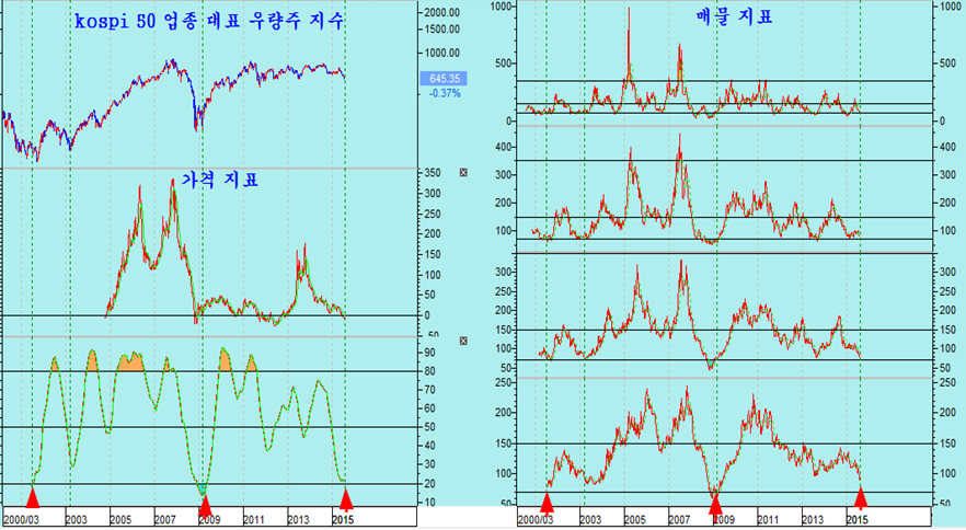 업종 대표주의 가격 지표와 매물 지표를 분석해 보면, 2003년과 2009년의 절호의 대형주 매수 기회가 되어 있다는 것을 알 수 있다. 사실 대형주가 매일 하락하니 지겹고 더 하락할까 봐 두렵지만 사실 알고 보면 한국이 망해도 망하지 않을 대표 우량주들인데 평소에 상상하기 어려운 가격으로 하락해 있다는 점을 감안하면 5년에 한번이나 올까 말까 하는 절호의 기회라고 생각할 수 있다.