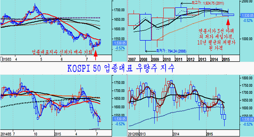 여하튼 업종을 대표하는 우량주 50종목 지수는 연중 신저가 근처에 머물며, 연봉을 기준 저가 매수 기준인 시가 3선 아래에 머물고, 지수 평균이 10년 평균권에 있어 10년간의 성장에도 불구하고 주가가 과거로 회귀하여 저평가 상태를 나타낸다.