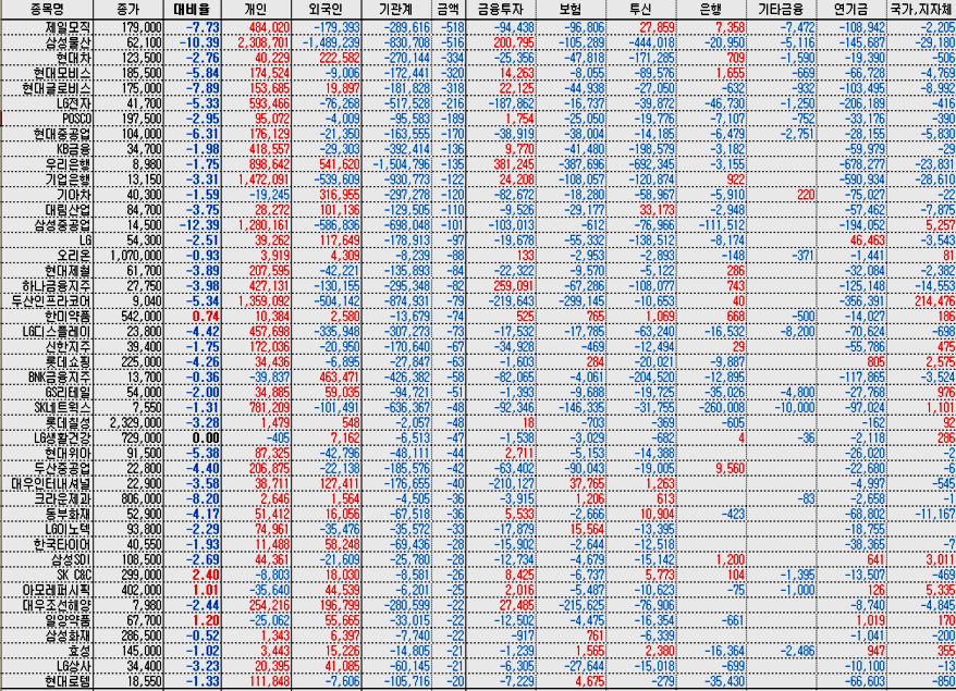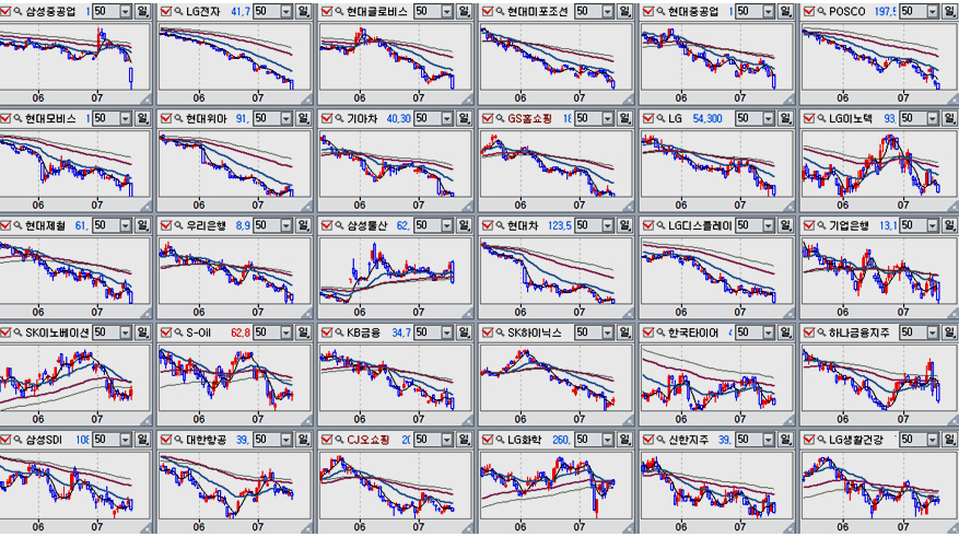 오늘도 기관은 경기 자동차, 조선, 철강, 은행, 기계 등 경기관련 우량주에 수천 억원의 매물을 쏟으며 이런 대형 우량주 주가를 급락으로 유인하였다.