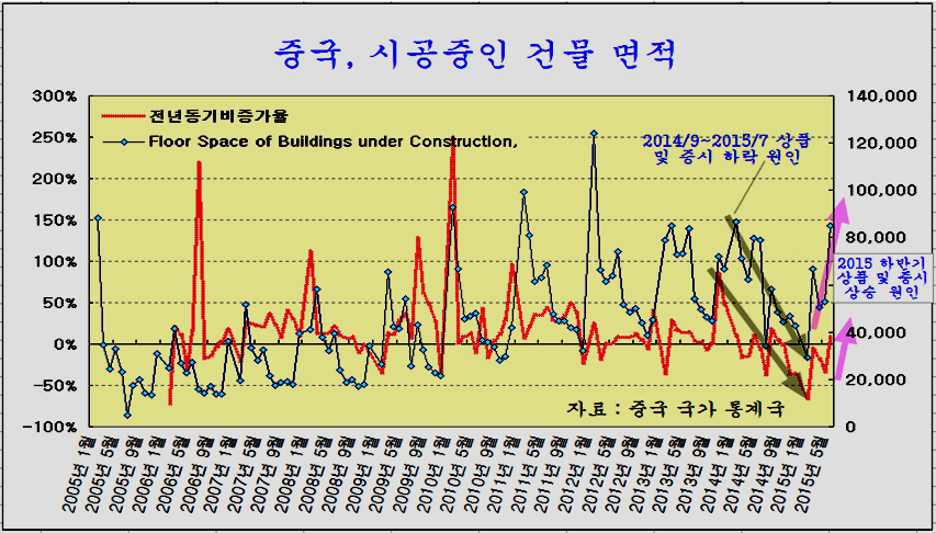 그러나 중국이 공격적인 경기 부양책에 올인하면서 지난 6월을 기점으로 이런 업황이 드라마틱하게 변하고 있다. 중국의 공사중인 건축 면적을 보면 5월까지만 해도 전년대비 33%의 감소를 보이며 심각한 위축 상태를 나타냈지만 6월에는 플러스 반전하며 7%의 증가를 나타내고 있다. 그야말로 드라마틱한 반전이다.
