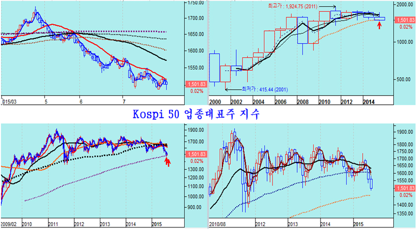 이에 따라 업종대표주 지수인 kospi 50 지수는 3개월 연속 장대 음봉을 만들며 연중 최저지수에서 마감을 하였다. 특히 주가가 10년 평균가격까지 밀려 10년에 두 차례 보기 어려운 저가 매수 기회를 주고 있다.