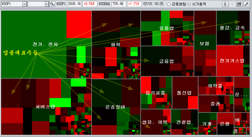 이 결과 시가총액 1위인 삼성전자의 하락으로 지수의 상승이 억제되고 업종대표주들이 눌려 있으나 이를 제외한 일반 종목은 화려한 상승을 하고 있다.
