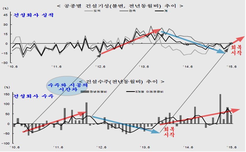 다만 내수에 가장 민감한 부문은 건설이다. 건설을 보면 2010년말 한시적 DTI와 LTV 규베 완화로 나타난 건설 경기 때문에 지방을 중심으로 수주가 증가한 결과 2012년 말부터 2013년 중반까지 건설 기성이 증가하며 건설업 업황이 호전되었지만, 다시 DTI 규제를 강화하면서 나타난 건설수주 감소가 2013년 하반기부터 2015년 중반까지 건설 기성 감소를 이끌었다.