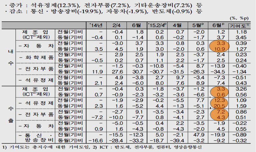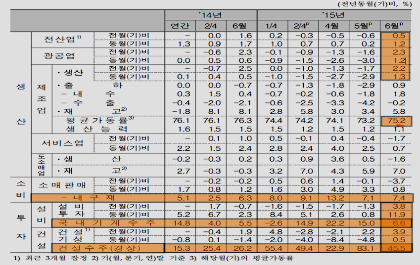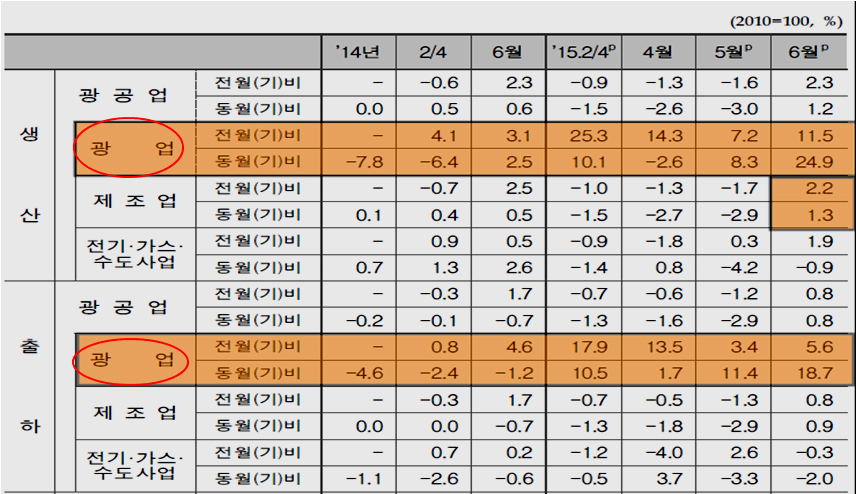 6월은 침체된 내수에 메르스로 소비가 위축되며 최악의 경기를 나타낸 한달이다. 그러나 오늘 발표한 산업생산 동향을 보면 광공업 생산은 마이너스 생산이 계속되다가 6월 들어 플러스 성장을 한 것으로 나타났다.