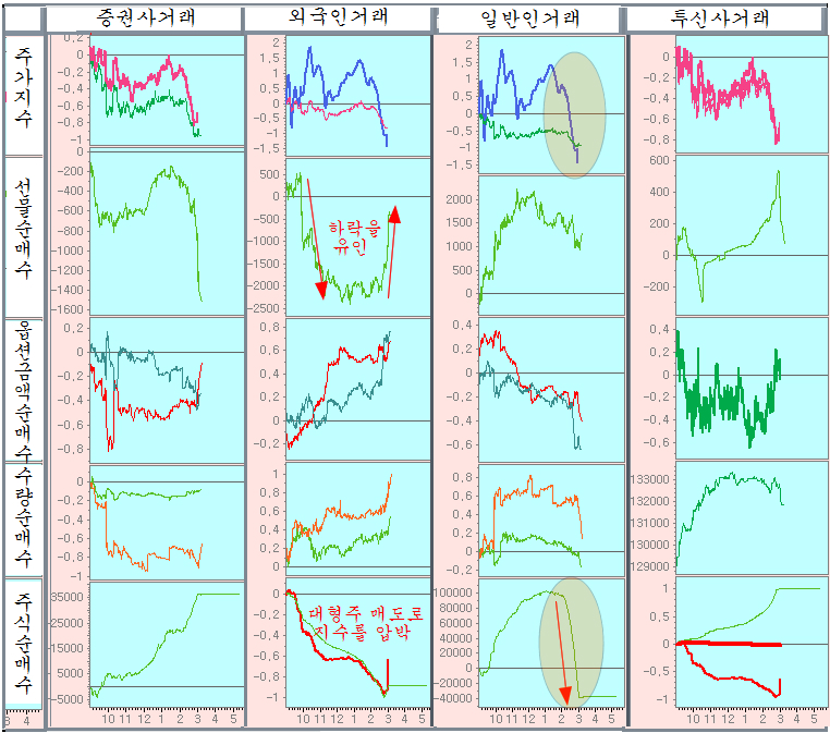 오늘은 선물과 현물 매도 공세로 기관의 매수를 압박한 끝에 지수를 밀어 내린 후 마감전 콜옵션 매수와 선물 매수로 주식 매도를 헷지하였다.