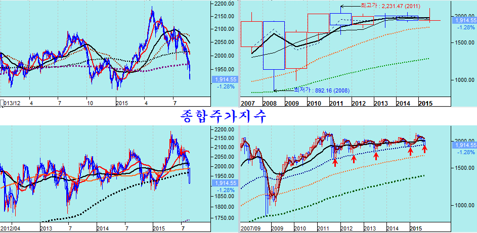 그러나 업종대표주 중심으로 장기 하락이 이어진 거래소 시장은 종합주가지수가 2011년부터 2014년까지 연중 최저 가격을 형성했던 60월(5년) 평균까지 조정을 거치고 있고 대형주가 오히려 이평선에 대해 아래로 이격을 갖는다는 점에서 상승을 준비하는 지수대이다.
