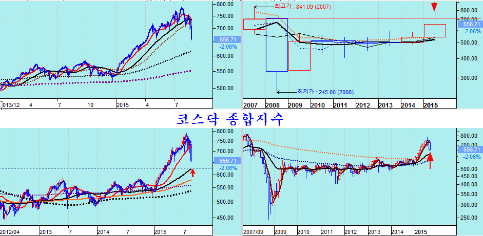 따라서 소형주와 함께 움직이는 코스닥은 이격 조정의 차원의 조정을 거치고 있지만, 이격 조정이라면 주봉 60주 평균, 월봉 20월 평균을 지지권으로 하여 점차 재매집 국면이 될 것으로 보인다.