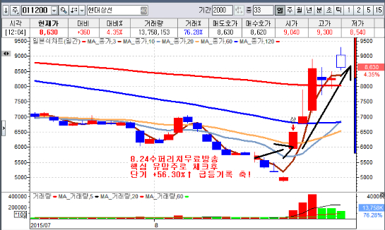 일예로 지난주 월요일(8.24) [수퍼리치무료방송]에서 현대상선과 코아스 딱 2종목을 장시작전