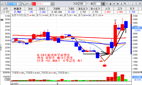 하면서 2종목 모두 +51~56% 의 단기 급등 시세를 기록한 바 있다.