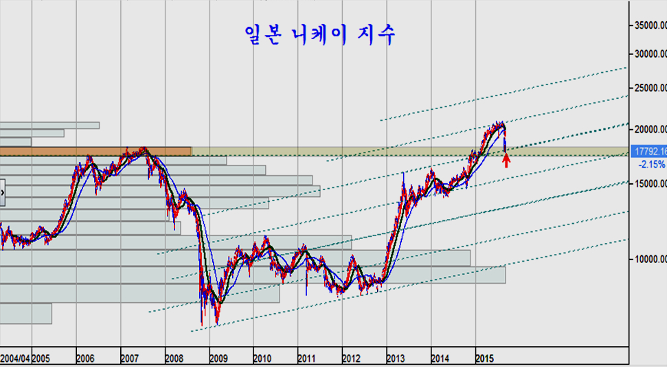 하락 과정에서 외국인의 매물이 급증하며 하락했던 일본 니케이 지수는 매물대가 강한 영역까지 조정을 거치면서 조정이 일단락 된 것 같다. 2015년 들어 오버했던 상승이 지지권에 접함으로써 새로운 추세를 시작할 여건이지만, 이제까지 경기 방어주 중심의 상승이었다면 앞으로는 경기민감주 중심으로 성격이 바뀔 가능성이 있다.