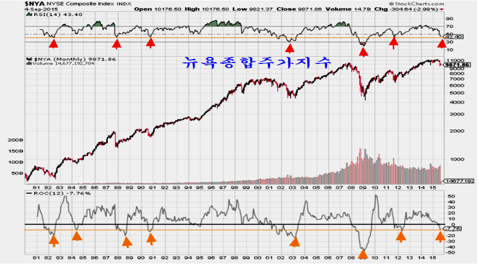 뉴욕시장이 단기로 어떻게 움직이던 장기적인 측면에서 보면 전년동기비 주가 상승률이 -7%가 넘는 과침체 국면이다. 지난 30년 주가 흐름상 이런 조건은 장기적인 매수의 절호의 조건이 되며, 이런 매수의 기회는 전체 종목중 50일 평균이나 200일 평균을 넘은 종목의 비율로 나타나는 시장의 과침체 수준에서 봐도 같다.
