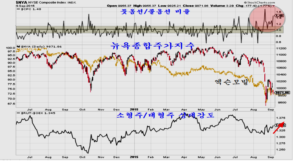4일밤 뉴욕시장은 하락으로 마감했으나 다시 풋옵션/콜옵션 비율이 1.48의 매우 투기적인 수준으로 치솟아, 펀더멘털과 관련 없이 투기적 거래 영향인 것을 나타낸다. 시장의 본래 모습을 엿볼 수 있는 소형주/대형주 상대강도가 상승 방향을 취함으로써 시장이 투기적 요인에 의해서 움직이고 있는 것을 나타낸다.
