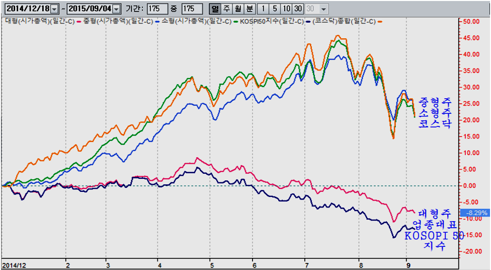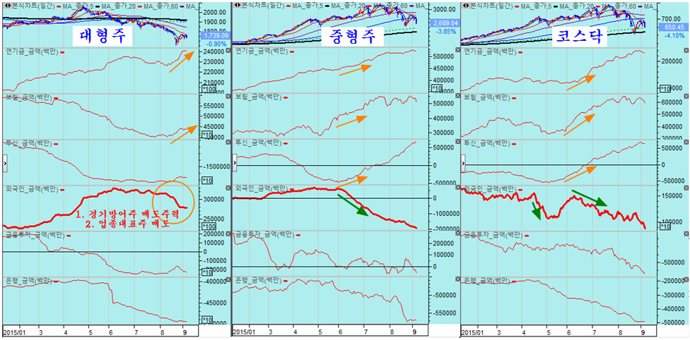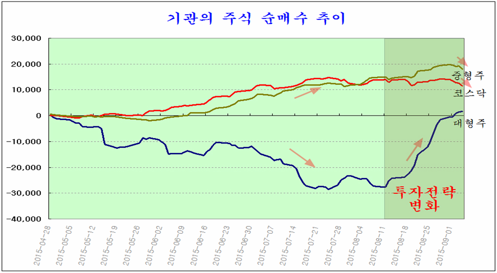 이렇듯 기관의 그간 상승을 주도 해 온 제약과 바이오 내수 서비스 업종을 중점적으로 매도하는 것은, 장세의 성격이 바뀌고 있기 때문이다. 기관은 지난 8월 11일 이전까지는 거래소 대형 우량주를 매도하는 대신 상승이 이어졌던 제약과 바이오 및 경기 방어형 내수 서비스 업종을 주로 매수했으나, 8월 12일을 기점으로 하여 이런 전략이 변화를 보이고 있다.