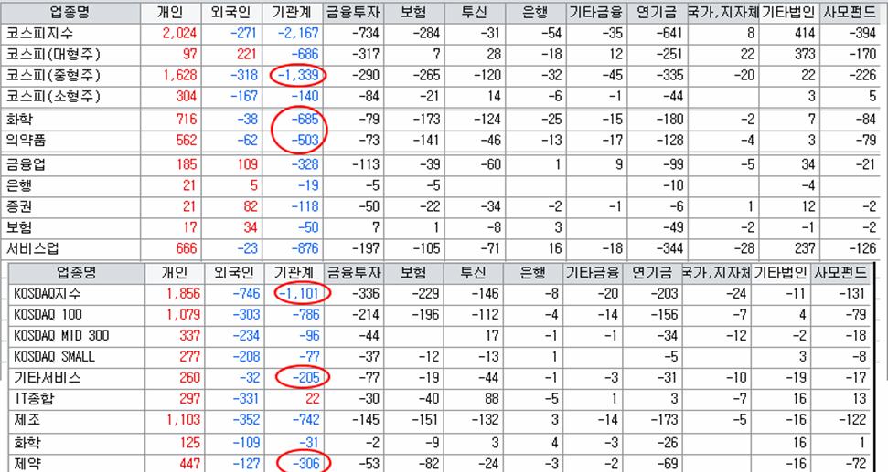 기관은 4일 거래소에서는 중형주 1339억원과 코스닥 1101억원을 순매도했는데 그 중심이 제약주를 비롯한 그간 상승을 이어왔던 내수주 중심이다. 코스닥의 하락폭이 큰 것도 코스닥 지수가 제약 및 바이오 옵종의 시가총액 비중이 크기 때문이다.
