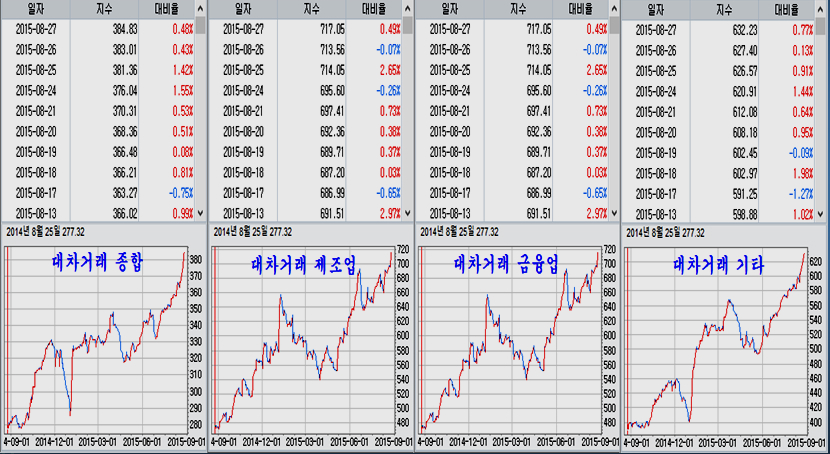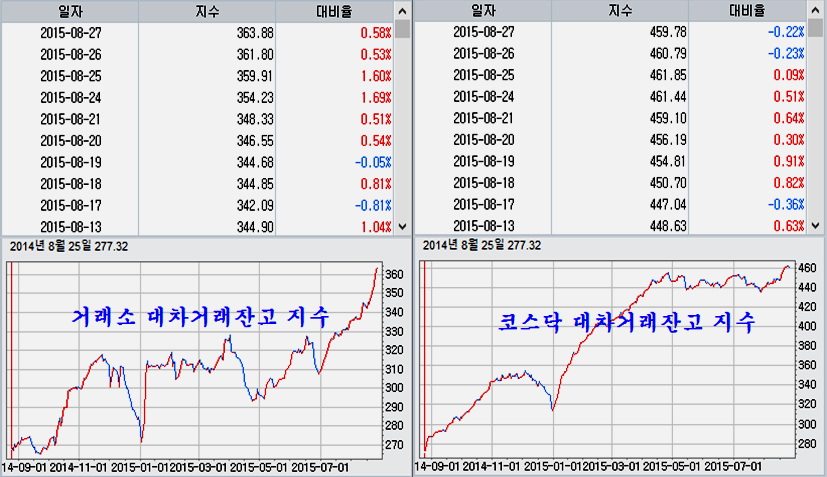8월 27일까지의 결과를 보면 특히 거래소 대차거래가 대단히 가파르게 증가했다. 이런 공격적인 거래는 시장에 신용잔고가 과포화수준으로 증가해 있고, 주가가 과도하게 높은 가격이어야 승산이 있지만 지금은 거래소 시장은 소형주를 제외하면 신용잔고가 많지 않고 주가는 대형주의 경우 6년 최저치를 기록할 정도로 낮게 형성이 되어 있다. 이런 점에서 가격 하락으로 승산을 얻기는 어려워 보인다.