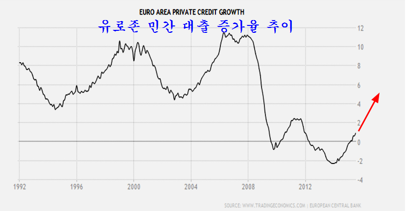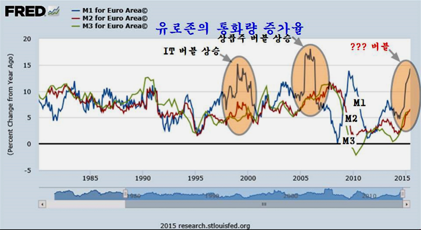 유럽의 통화 공급이 심상치 않다. 2008년 금융위기 이후 부채 감축에 주력하면서 통화 공급을 줄여왔던 유럽이 2014년 부채감축을 끝내고 양적 완화를 시작하면서 통화 공급이 가파르게 치솟고 있다. M1 통화량의 증가는 14%에 다가서 세계적인 IT 버블이 있었던 1999년말과 세계적인 주택 버블이 있었던 2006년 수준에 근접하는 모습을 보여준다.