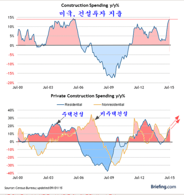 미국의 경기에 대해서는 건설지출 하나로 흐름을 보는 것으로 족하다. 미국의 건설투자지출은 7월 전년동월비 13.7%의 증가를 보임으로써 2006년 부동산 활황기의 최고 증가율에 근접하고 있다.