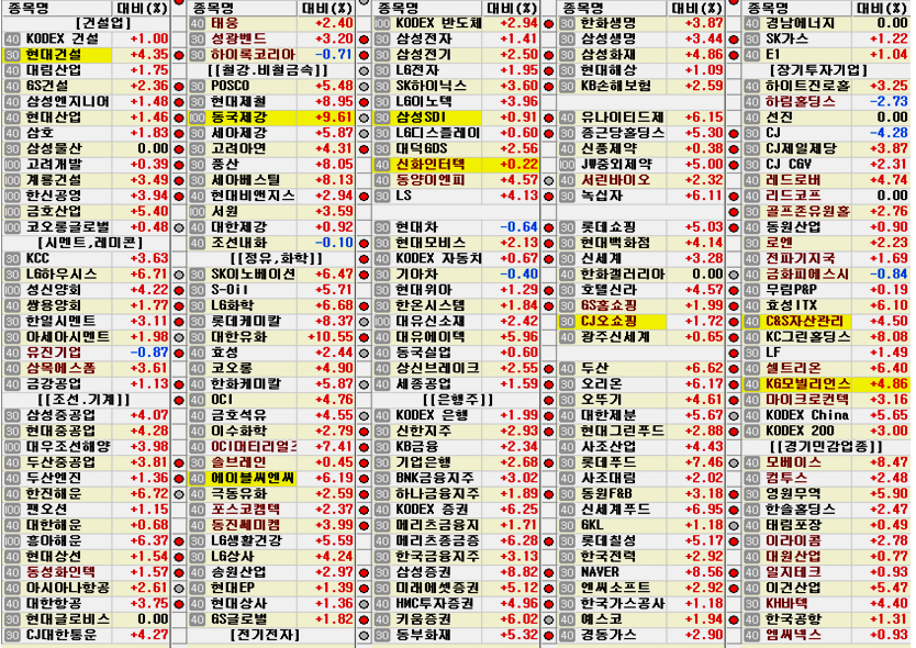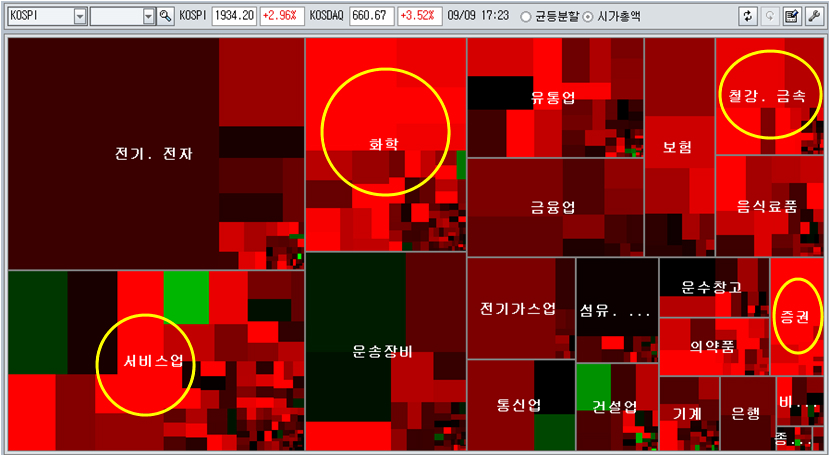 그간 공매도의 표적이 되었던 철강과 화학 정유 그리고 증권주가 강력한 상승을 하면서 시장을 주도했다. 외국인은 하락으로 매수세가 소진된 제약과 음식료 유통업 주식을 사서 다시 매수할 세력을 끌어 모으려는 모습이다. 917종목 상승에 132종목 하락으로 모처럼 시장 전반이 강한 상승의 모습을 보였다.