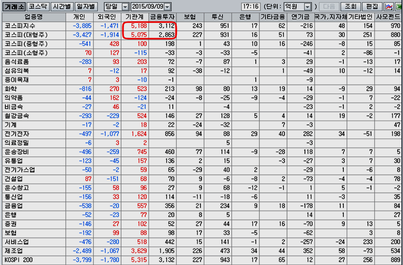 기관은 증권사 3112억을 포함 5188억원의 순매수를 기록했으나 중형주 매수는 100억원에 그쳤고 소형주와 코스닥은 순매도를 기록했다. 지수와 관련된 Kospi 200 종목에는 5315억원의 순매수를 기록해 매수가 집중되었다.