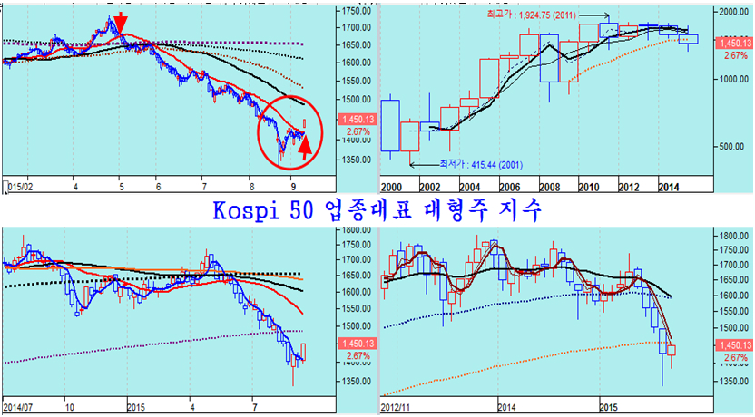 대형주에 집중된 기관의 매수로 Kospi 50 업종대표 지수는 지난 5월 20일 평균을 하향 이탈한 이후 처음으로 갭으로 20일 평균을 넘어 장대 양봉을 만들었다. 중기 추세선인 20일 평균을 강력한 수급과 함께 갭으로 돌파하여 기나긴 하락을 마감하고 상승으로 전환되는 모습을 만들었다.
