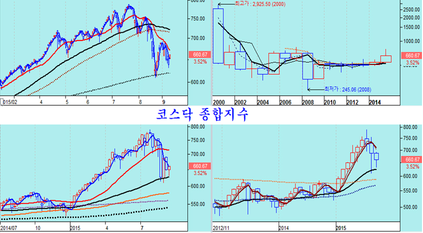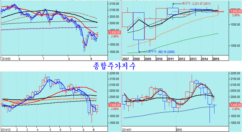 한편, 종합주가지수도 20일 평균선을 넘어서며 60주 평균을 지지권으로 하여 상승하는 자세를 취했고, 코스닥 지수는 3.52%의 상승에도 불구하고 아직 20일 평균을 넘지 못했으나 60주 평균에 조정의 저점을 만드는 모습이다.