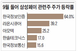 삼성전자의 모바일 간편 결제 서비스 '삼성페이'의 가입자가 늘면서 관련주도 상승 흐름을 이어가고 있다.