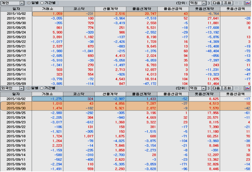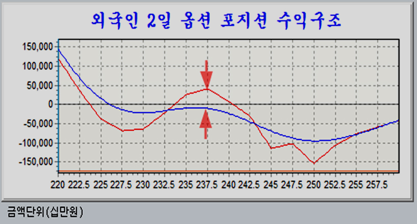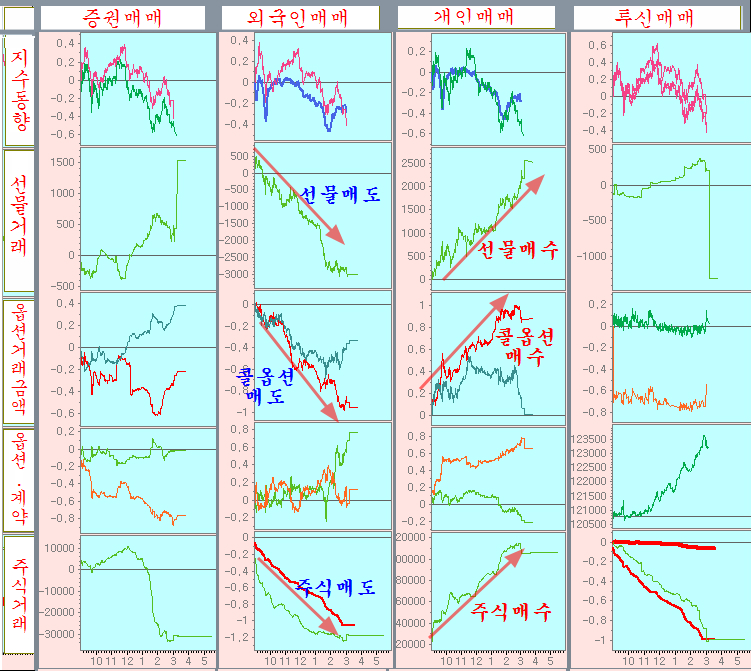 오늘 거래에서는 개인 투기 세력이 다소 과도하게 상승을 겨냥한 포지션을 늘리면서 외국인에게 수익의 기회를 만들어주고 있다. 다음주 목요일이 옵션 만기이기 때문에 시간가치가 빠르게 감소하는 주말을 앞두고 개인의 콜옵션 매수 확대가 오늘 지수의 조정 마감의 원인이 되었다. 월요일 주가가 약보합으로 시작하더라도 외국인이 수익을 얻는다.