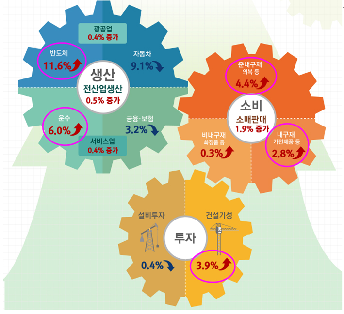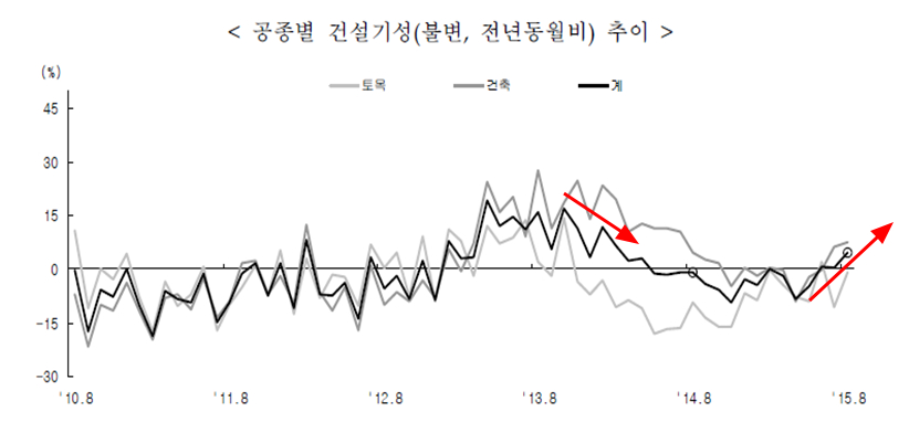 둘째, 장기간 하락해 온 건설 기성이 플러스로 전환된 데 이어 2013년 상반기 이후 가장 높은 증가율인 3.9%로 급격한 증가를 보이고 있다. 건설 수주로부터 18개월 정도 시차를 두고 나타나는 건설 기성은, 건설에 필요한 시멘트, 철근, 목재, 석재의 소모량 즉, 이들 산업의 매출액과 운수업체의 운송량 그리고 건설업체의 매출액과 직접 관계한다.