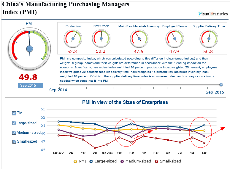 그러나 중국 통계국에서 3000개가 넘은 기업을 대상으로 조사하는 중국 제조업 PMI는 9월 49.8로 0.1포인트 상승을 보이고 있고, 특히 기업을 대형, 중형, 소형으로 구분할 때 대형기업이 가파른 회복을 보이고 있다.