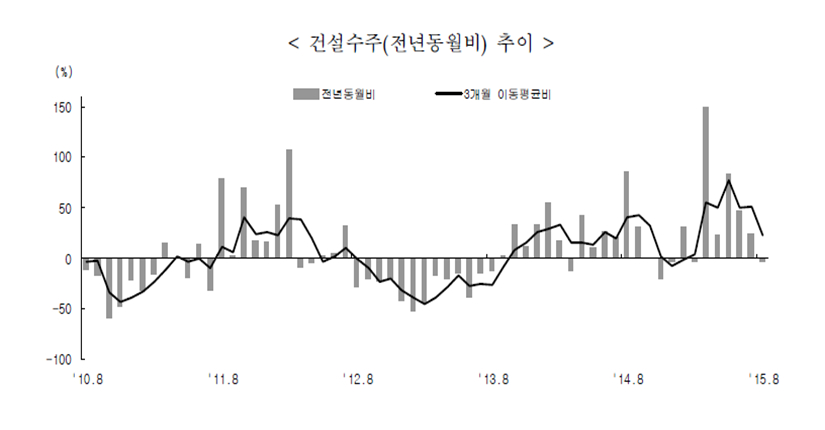 2011년 말부터 호전된 지방의 주택 경기 때문에 건설기성은 2012년말부터 2013년말까지 증가를 나타냈으나, 2011년 말 이후 건설 수주 감소가 이어지면서 2013년말 부터 지금까지 건설 기성이 감소해 왔다.
