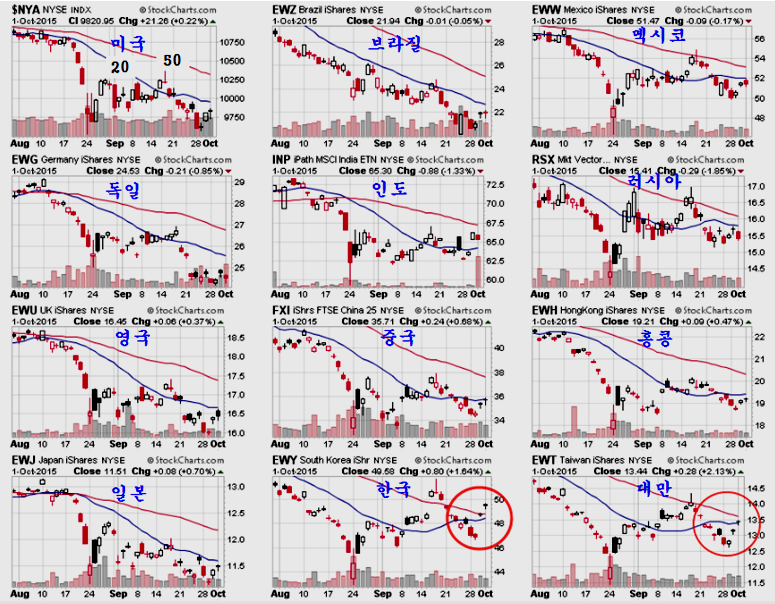 다시 말하면 한국의 종합주가지수는 세계 경제에 대한 선행지수로서 활용된다. 뉴욕시장에서 거래되는 주요국가의 ETF를 보면 블랙록의 한국펀드인 EWY가 가장 먼저 60일 평균을 넘어서고 있다. 대다수의 국가의 펀드가 20일 평균도 넘지 못한 상태에서 이렇게 앞서는 모습은 지난 수년간 보기 드물었던 모습으로 세계 경기가 회복 국면일 때, 반도체와 IT경기가 회복국면이 시작될 때의 모습이다. 물론 반도체가 시가총액의 차지하는 비율이 한국 다음으로 높은 나라가 대만이며 실제 대만 주가가 두번째로 빠른 모습을 볼 수 있다.