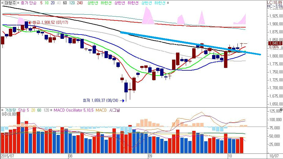 대형주 업종은 이미 하락각의 60선 악성물량을 흡수후 상승흐름이 가시화 될것으로 보여지고