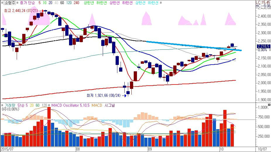 대형주 소형주 공히 하락하고 있는 60일선의 저항을 극복하는게 관건이 된다