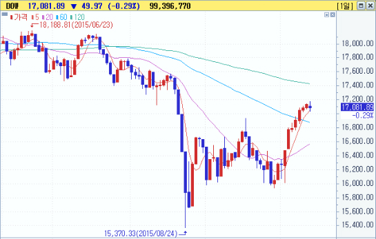 다우지수는 0.29% 하락한 17,081,89포인트, 나스닥지수는 0.87%하락한 4,796,61포인트를 기록하였습니다.