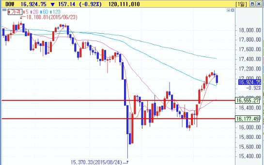 다우지수도 0.92% 하락한 16,924.75포인트를 기록하였고, 나스닥지수도 0.29%하락한 4,782.85포인트를 기록하였습니다.
