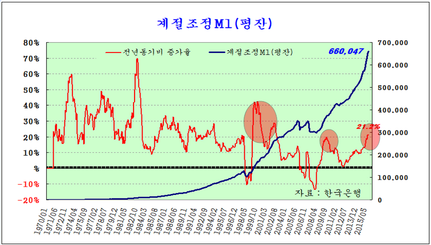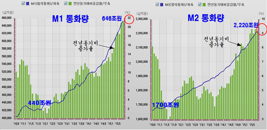 그 뿐인가? 시중에 돈이 늘어나는 속도가 예사롭지 않다. 연간 20%가 넘는 속도로 풀리는 돈은 과거 주가가 폭주할 때의 조건이다. 이 속도로 4년이 지속되면 통화량은 지금보다 두 배가 되고 집값을 포함한 주가와 물가가 모두 2배가 될 수 있는 엄청난 돈 풀림이다.